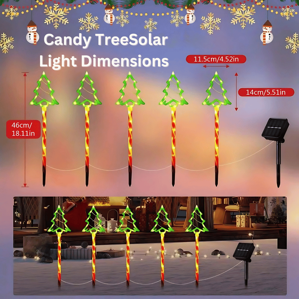 Each Candy Tree Solar Light stands 18.11 inches (46 cm) tall, with the tree portion measuring 4.52 inches (11.5 cm) wide and 5.51 inches (14 cm) tall. These lights are connected in a line, creating a charming and cohesive look for your holiday display.